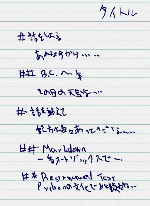 また、「レコーディング」の過程の話に戻りますが、レコーディングのルールをMarkdownやRestructuredTextに近いものにしておくと、ノートやメモをまとめる際に、脳内でルール変換する手間が若干省けるので、まとめる際のストレスが少し軽くなると思います。